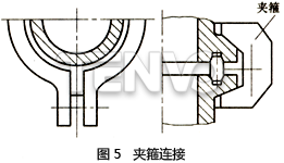 夾箍是一種不帶法蘭的連接,如圖5所示,夾箍連接使螺栓的數(shù)量減少到兩個,使組裝和拆卸都簡化了,有利于快速拆卸。同時(shí)外形尺寸和重量都有所減少,目前有些部門已大量采用。