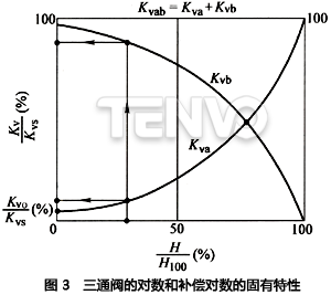 如果有一個(gè)閥芯的固有特性是對(duì)數(shù)的,那么其他的閥芯的固有特性必須是補(bǔ)償對(duì)數(shù)的,這樣才能互相配合,如圖3。只有這樣,各種開(kāi)度下兩個(gè)Kv值相加才是個(gè)常數(shù)。