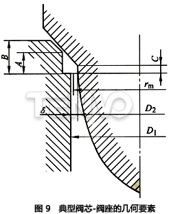 另一種使實(shí)際可調(diào)比接近理論可調(diào)比的方法,取決于閥芯結(jié)構(gòu)。它使系數(shù)Kvr和Kvo十分接近。從這個(gè)意義上講,要求閥座和閥芯的制造符合設(shè)計(jì)圖樣,其圓度和偏心的誤差應(yīng)盡量小。典型的閥芯-閥座的幾何要素如圖9所示,圖中A、B、C、D1、D2尺寸應(yīng)準(zhǔn)確。